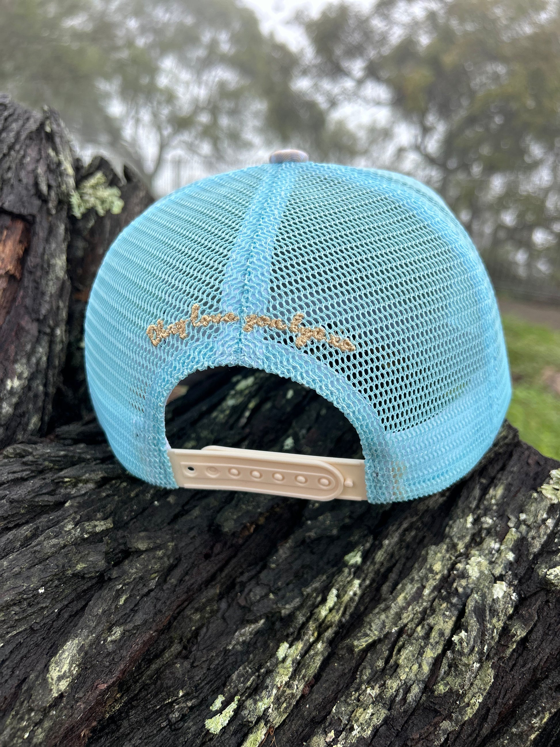 Blue and gingham fabric, pastel green embroidery with a cream snapback feature, "okay love you bye xo" saying on the back, heart on the right temple meaning is to "love your mind the right way", mesh back for breathability.